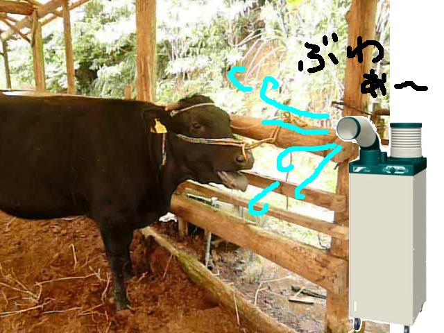 エネルギーの無駄を出さないためには可能な限り狭い密室でクーラーをつけるのが良いはずです。ワラ倉庫の一角に冷暗室を設け、スポットクーラーを設置して熱中症の牛を避難させるのが理想的です。