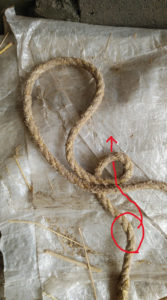 * * * * * * * * * ロープを使って牛を柵などに繋ぐことを、鹿児島弁では「こびる」と言います。最初の頃は「先生、そん牛こびっといてくれやん(その牛繋いでおいて)」と言われて「???」となっていましたが、最近は慣れて何とも思わなくなりました。 何か良い保定方法はないものか・・・と往診しながら探していたところ、診療先の農家さんで面白い結び方をされていた方がいらしたので、今回紹介させていただきたいと思います。それが下の写真になります。 ロープの端を引っ張ると・・・ ほどけました! ロープの端の輪っかを片蝶結びにすることで、牛の頭にかかっている側のロープから外せるようにしてあります。 これでいつものように牛を捕まえるだけです。簡単ですね。 |