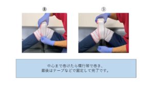 皆様お疲れ様です。今回も引き続き包帯の巻き方を紹介します。 今回は集合亀甲帯を紹介していきます。集合亀甲帯は前回の離開亀甲帯とは逆に関節部(屈曲部)から離れたところから内側に向かって包帯を巻いていく方法です。2種類の巻き方のうちどれを選ぶかは患部の場所や状態によって決めます。