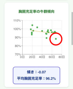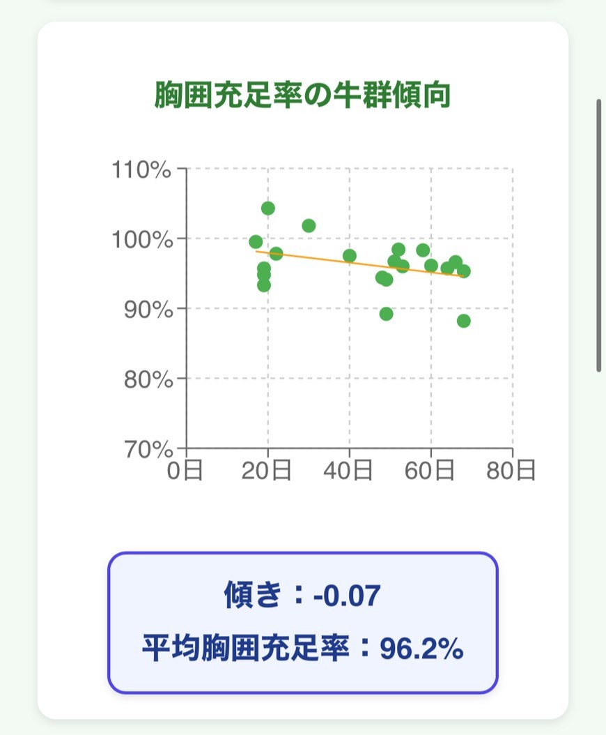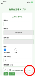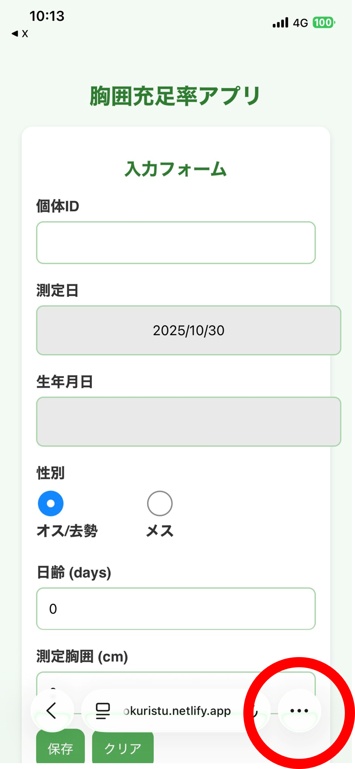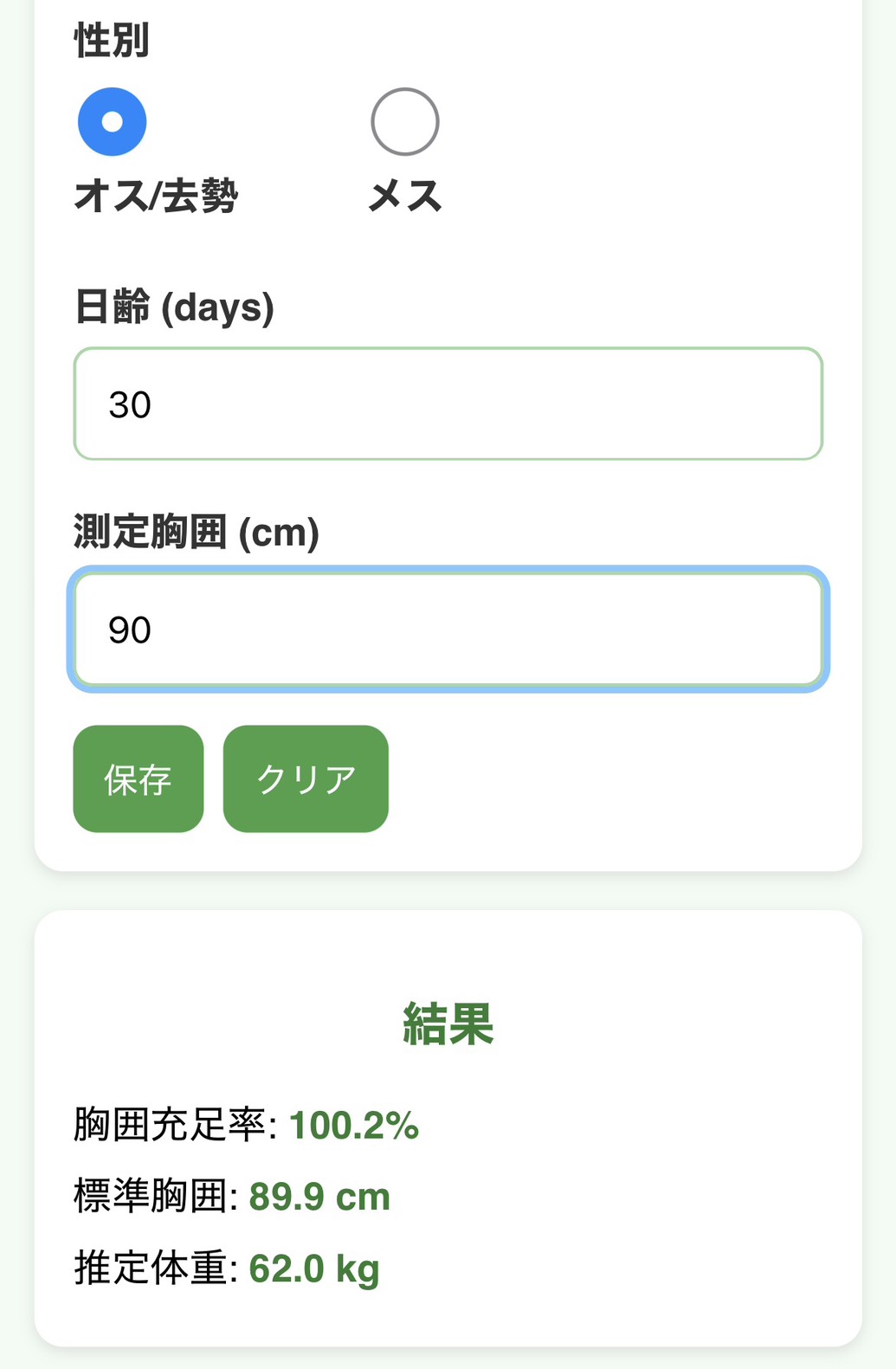 2. ウェブアプリをスマホのホーム画面に追加する 【Androidの場合】 【iPhone】 ホーム画面に追加すると、以下のような感じになります。すぐに使うことが出来るため非常に便利ですが、追加しなくても使用はできます。 3. 子牛の胸囲を測定する 測定に使うメジャーは何でも良いです。私は裁縫用の100円くらいのメジャーを使っています。 胸囲の測定方法は全国和牛登録協会の方法を参考に行います。具体的には子牛を正姿勢にし、肩甲骨後縁の指二本分後ろの位置でメジャーを巻きます。メジャーは最初にやや強く締め、その後緩め、その中間の目盛りを確認します。 測定時の子牛の姿勢は大事です。首を曲げたり、頭を下げたりすると数値がズレてしまうためです。 4. ウェブアプリに情報を入力する この結果を記録したい場合は、保存を選択します。保存すると、画面下の記録一覧に記録されます。 さらに2頭以上を同様に測定、入力、保存を行うとグラフ(散布図)が表示されるようになっています。測定した牛の平均胸囲充足率、近似直線の傾きも表示されます。 5. 牛群の発育の傾向を確認する では例として、下の結果をご覧ください。これはとある農場で21頭の子牛を測定した結果になります。 結果は平均胸囲充足率が96.2%、傾き(近似曲線の傾き)が-0.07となっています。この結果から、測定した牛群は日齢を追うごとに発育が若干遅れ気味になっていることがわかります。飼養管理見直しなどの対策することで、平均胸囲充足率も高くなり、さらに病気に強い牛群に出来る可能性もあるということです。 また個別の胸囲充足率を見ていくと、牛群の中で明らかに発育が遅れた牛がいることがわかります(赤丸)。 こういった牛は過去の治療歴などを調べると、「低体重で生まれた」「下痢が長引いた」などの何かしら異常があることがあります。そういった場合は、個別に対策を考える必要があります。また将来的に病気しやすいこともありますので、哺乳期間の延長や脂肪酸の添加などの対応を検討しつつ、要注意牛として頭にいれておく必要があります。 このように日齢をバラけさせて複数頭測定することで、牛群の傾向を把握することもできます。可能であれば哺乳期から離乳後まで測定すると、離乳の影響なども調べることが出来るためオススメです。 長文になってしまいましたが、以上が現時点でのざっくりとした使い方になります。他にも結果のCSV出力などの機能もありますが、今回は割愛します。 ウェブアプリの機能に関しては、今後もアップデートする予定です。何かご意見やご質問、ご相談などありましたら、ぜひホームページの「ご質問・ご相談」コーナーなどから教えていただきたいです。 前回のコラムでも触れましたが、DGや胸囲充足率のように発育を数値化するということは非常に重要だと感じています。ぜひ今回のコラムやウェブアプリがご参考になれば!と思います。 皮下注射や静脈注射、気管内注射などの仕方も解説しています。わかりやすいようにQRコードを付けてあるので、スマホをかざせば動画も見られますよ。 10月末発売。 |
