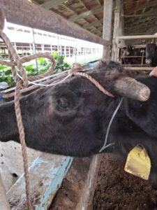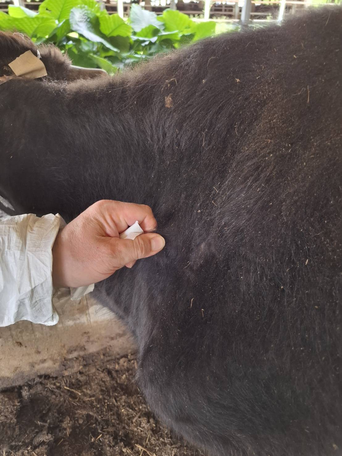 2025年11月17日 *********************************************************** ところで、以前もお話ししましたが、目が落ちくぼんでいると聞くと、まずは脱水を疑います。しかし、目がくぼんでいるからといって、すべて脱水というわけではありません。脱水の確認には、必ず皮膚をつまんで戻り具合を見るテントテスト(ツルゴールテスト)を併用しなければなりません。つまんだ皮膚がすぐに(2秒程度で)元に戻らない場合は脱水があると判断できます(写真1)。 もしも目がくぼんでいても、テントテストが正常であれば、他にいくつかの状態を疑う必要があります。まずは、疝痛(お腹の傷みが激しい)場合です。この時も眼球は引っ張られて落ちくぼんで見えます。目玉を動かす筋肉は、眼球の上下左右に4か所(本当はほかにも2か所あるのですがややこしいので簡単に4か所と書きます(図1))ついていて、この筋肉が右側だけ収縮したら、目玉は右を向くようになっています。しかし、ショックの時などは、4か所とも筋肉が収縮(緊張)するため、目が奥に引っ込んでしまうのです。(写真2) もう一つ、こちらは生後19か月齢以降の牛では注意しておく必要があるのですが、眼球は、頭蓋骨の中の「眼窩」というくぼみの中に納まっています。そして眼窩と眼球の間には脂肪がついていていわば眼球を少し押し出したような状態になっているのです。ところが、脂肪壊死症になると、この眼窩内の脂肪が委縮するため、目が落ちくぼんで見えます。19か月低以降の肥育牛や、分娩前後の繁殖牛では、眼球が落ちくぼんでいるかな?と感じたら、必ず直腸検査をしてみましょうね。 |