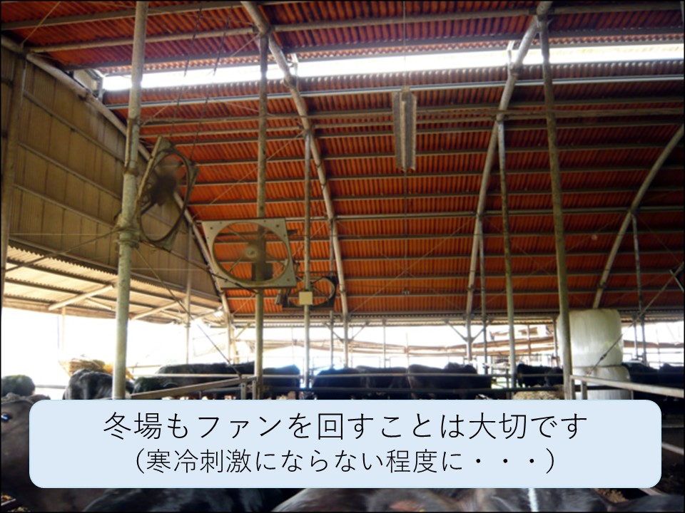 最後に冷気の遮断と換気の両立という難しい問題について考えてみましょう。舎内に冷気を入れないように締め切ってしまえば牛の尿やふん便によって徐々に舎内のアンモニア濃度が高くなり、それにより粘膜が傷つき鼻腔粘膜におけるバリア機能が著しく弱まってしまいます。また、空気中の細菌やウイルス量が増加していくため、感染の機会が高まります。換気をしっかりすれば、こうした問題は避けられますが、寒冷刺激が強まります。これは大きなジレンマで、頭を抱えてしまいます。