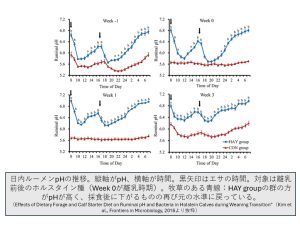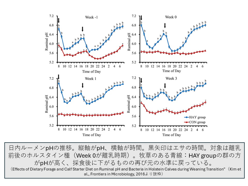 2026年2月5日 *********************************************************** スターターは子牛用の濃厚飼料です。栄養分となる揮発性脂肪酸が発生しやすいのはもちろんですが、発酵により生じる酸の中には乳酸も含まれるため、ルーメン内のpHは採食後にしっかりと下がっていきます。濃厚飼料はデンプンが主体のため、菌による発酵分解が粗飼料よりも速く行われます。逆に、粗飼料はほとんどが繊維質のため、分解速度は非常に遅くなります。ホルスタイン種におけるデータですが、粗飼料を与えていた群では飼料給与のタイミングでpHが下がりその後徐々に戻っていく、という推移に対し、粗飼料がない群ではずっとpHが低いままで1日が終わっているという報告が挙げられています。 上がり下がりがない分良いのでは?と思われるかもしれませんが、粗飼料がない群では「ずっと酸性度が高い」状態が続いているため、慢性的にアシドーシスになってしまっているのです。逆に、粗飼料が給与されていると「pHが高い時間帯がある=ルーメン内の酸性度が低い環境が一定時間提供される」ことになります。この間に、一旦は低pH環境下で数を減らした有益なバクテリアや原虫がその数をもとに戻したり、ダメージを受けた胃粘膜を回復させたりすることができます。哺乳期にはあまり意識することがないかもしれませんが、子牛のアシドーシスも粗飼料の給与でその影響を小さくすることができるようです。 |