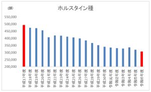 分類上は12種類に分けられるのですが、実質的には、ホルスタイン種、交雑種、黒毛和種の3種でほぼすべてが説明できてしまいます。ジャージー種や褐毛和種などをはじめ、他のものは、グラフ上ではほとんど確認できないレベルです。
