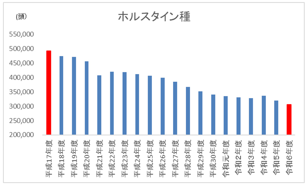 ホルスタイン種のと畜頭数の動きは、非常にわかりやすいです。平成17年度の493,934頭をピークに、その後は減少し、令和6年度には305,873頭まで落ち込んでいます。およそ4割減です。この減少は、ホルスタインという牛そのものの問題というよりも、酪農全体の構造変化がそのまま反映されていると考えられそうです。