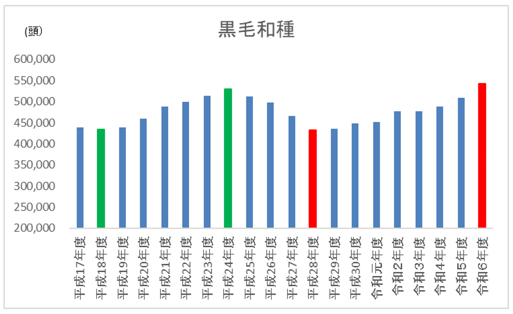 平成18年度ごろから頭数が増え始め、平成24年度でいったん天井を打ち、そこから減少に転じます。その後、平成28年度に再び底を打ち、令和6年度に向けて再上昇しています。非常にきれいな波の形を描いています。この波は、黒毛和種という牛の性質そのものをよく表しているように思います。繁殖を増やすと決めてから、子牛が生まれ、肥育され、枝肉として市場に出るまでにはどうしても時間がかかります。その間に子牛価格や枝肉相場、飼料価格などが何度も変動します。結果として、数年後に供給が増えて相場が下がり、また控える、という循環が起こりやすい。黒毛和種のと畜頭数の波形を見ていると、日本の肉用牛生産がいかに「時間差のある産業」であるかを改めて実感させられます。