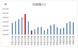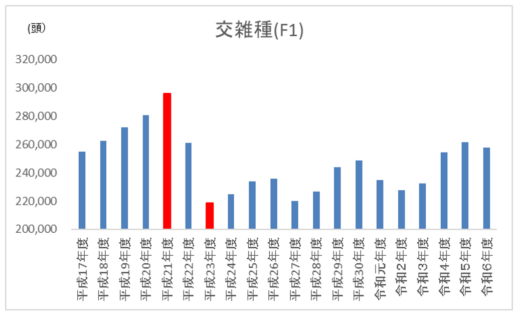 交雑種は、さらに少し複雑です。平成21年度から平成23年度にかけて大きく頭数を落とし、その後はおおよそ5年周期くらいで小さな増減を繰り返しているようにも見えます。交雑種が読み取りにくいのは、その立ち位置が常に中間にあるからだと思います。乳用後継を確保したい酪農側の事情と、肉としての採算を重視する肥育側の事情、和牛受精卵の動き。さまざまな要因に引っ張られます。相場が良ければ増えやすく、少しでも状況が悪くなると真っ先に調整されやすい。交雑種は、ある意味で日本の牛肉生産における「調整弁」のような存在で、その役割がそのまま数字に表れているようにも感じます。