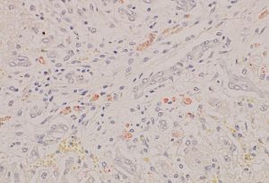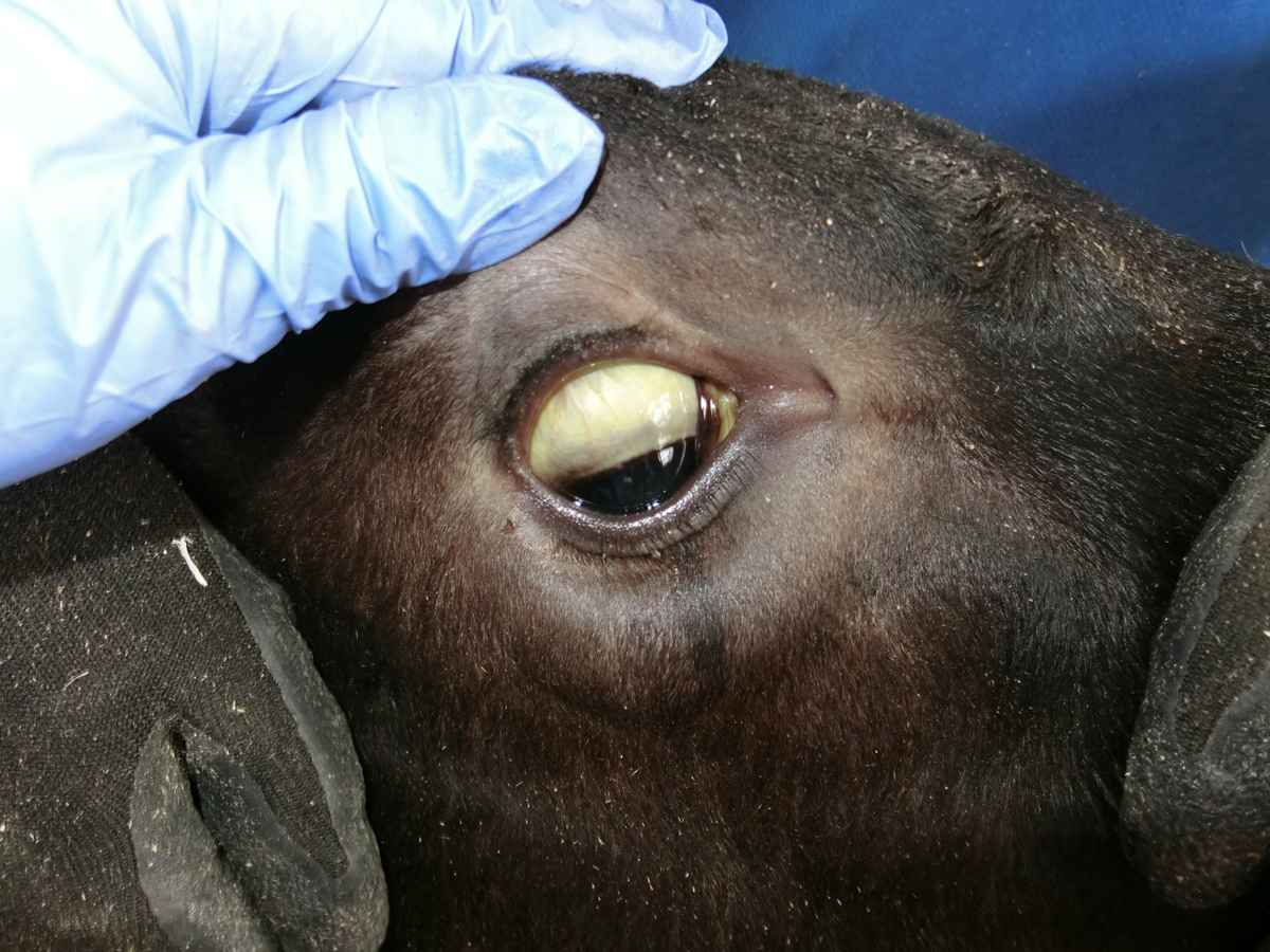 死亡した子牛の眼を見ると、明らかな黄疸で(写真2)、死後解剖では肝臓に銅の沈着(ロダニン染色という方法で調べます)が見つかります(写真3)。