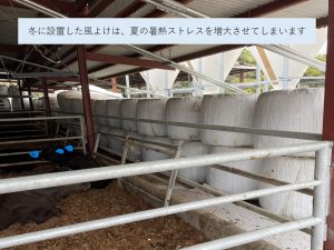 牛自身だって熱源になりえます。人がいっぱいいる部屋では冬でもその部屋全体が暖かくなるように、牛もぎゅうぎゅうに詰まっているとより暑くなります。牛舎で管理する頭数の調整は非常に難しいですが、出荷前の牛や分娩直前の牛など、牛にとって大切な時期だけ限定的に密度を低く抑えることができないか、牛舎構造を改めて眺めてみてはいかがでしょうか。