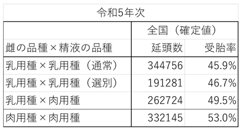 今回のデータで小生がまず注目したのは、乳用種×乳用種(通常)と乳用種×乳用種(選別)の差です。選別精液の受胎率は46.7%で、通常精液の45.9%をわずかに上回っています。ひと昔前であれば、選別精液は受胎率が悪いという印象があったのですが、全国規模で見ると、少なくとも令和5年次においては、選別精液が明確に悪いとは言えない数字が出ています。これはちょと驚きでした。