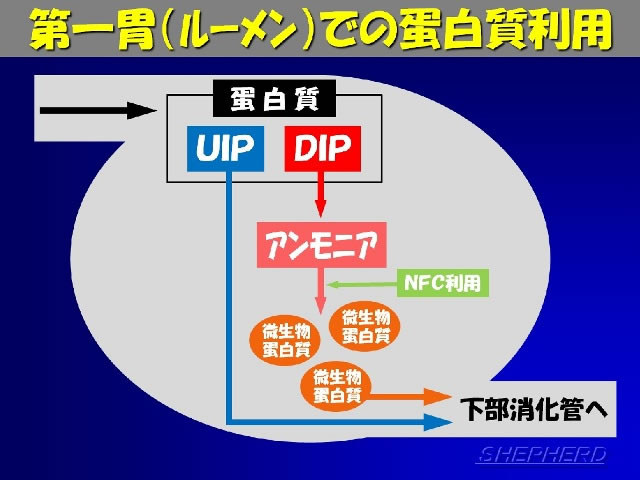 2012年10月19日 肥育牛で尿石症ができるメカニズムの一つには、反芻動物の特徴的な蛋白質の利用方法が関係しています。牛さんを始めとした反芻動物では、食餌から得た蛋白質の一部(分解性蛋白質:DIPと言う)はルーメン内の微生物によってアンモニアにまで分解され、そのアンモニアはルーメン内微生物の増殖に利用されて微生物蛋白質となり、第四胃以降の消化管で消化・吸収されます。 DIPとNFCのバランスが取れている時は、牛さんは効率よくアンモニアを利用して微生物蛋白質を合成します。しかし、DIPが多くなったり、逆にNFCが少なくなったりして、DIPとNFCのバランスが崩れてしまうと、微生物蛋白質に合成できないアンモニアが増えてしまいます。 あふれてしまったアンモニアは生体にとって猛毒なので、どうにかして体の外に出す必要があります。そのメインとなるのが尿として排泄するルートです。簡単に言うと、おしっこの中にアンモニアを溶かして体の外に出すのです。が、このアンモニアの処理方法が尿石症を引き起こす原因にもなっているのです。 前の記事 尿石症を考える(15) | 次の記事 尿石症を考える(17) |
