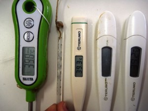 2013年2月13日 ああっとっ!!! 体温計の(脳内)キャリブレーションをしないと、いきなり実戦投入では使えませんよね?? 現時点で当診療所で使っている水銀式体温計(×1)、TERUMO人体用予測体温計(×3)、TANITA料理用体温計(×2、同一品色違い)を使って、測定温度の違いを調べてみました。 結果は・・・ うーん・・・どれを基準に考えるかも難しいですし、メーカーさんの事情もあるでしょうから、スパッと考察するのは難しいのですが・・・ まず、TERUMOについて・・・3機種とも違う品番の品ですが、サーミスタの性能は同じで、予測式という点も同じでしたので、3本とも0.1℃以内の誤差で一致した点は製品としてとても信頼が持てます。他の実測式のものとの計測温度の違いは、検温した物質が「水」であったため熱伝導率や予測曲線に違いが出たためかな??また、「人体式」であるため、36℃前後では(予測)精度が高く、あまり高温や低温ではずれが大きいのかな??と考察しておきます。ただ、実際の現場で牛の体温を測る時にはさほど違和感がないようです。むしろメインユーザーの池田先生はちょっと高めに出るかもという印象を持っています。 水銀式体温計は実測でアナログですので、考察も何もありませんが、以前蓮沼先生が使っていた人体用(と思われる)水銀式体温計は、同じように試験した時に動物用のものと0.5℃以上違ってぶったまげた記憶があります。水銀計と言えども絶対の信頼はおけません。 そしてTANITAです。同じ商品の色違いの2本で試験したところ、全く同じ数値が出たので、精度に関してはとても信頼しています。水銀系に近い値が出たことでさらに安心感が増しました。実際の現場での私のインプレッションは「やはり水銀より若干高いかな~」という印象を感じています。 以上、体温計の測定比較試験でした~ |