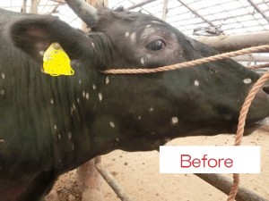 2014年7月4日 前回の白癬実験の結果です。硫黄と食用油を混ぜたものを1日1回塗る、という作業を3~4日間やってみました。 頚部はだいぶきれいになりました。 続きまして2頭目・・・ 青い耳標は取れてしまいましたが同じ牛です。1ヶ月経ったせいか、かなりきれいになりました。肉眼でみると痕が残っているのが分かる程度でした。 3頭目・・・ 治るまではしばらく時間がかかりそうですが、目の周りはだいぶ良くなってきた感じです。目の周りは目に入らないようにかなり控えめに塗ったのですが、それでも効果はありそうです。 今回は3頭とも塗った後は放置し、それぞれ期間を空けて様子を見てみました。見る限り、そこそこ効果はありそうな感じです。 *行う際にはなるべく頚部で1部分だけ塗って1日ほど置き、牛さんの皮膚に異常がないか確認してから行うことをお勧めします。 |