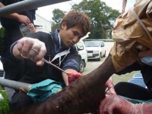 2015年6月23日 9回にわたって“膝瘤”について紹介してきました。(*‘∀‘) “膝瘤”といっても…ごく小さくて日常生活に支障のない大きさであれば経過観察でいいと思います。床材を多めにしてあげたり、飼槽の高さや奥行きを調節してあげたり…膝瘤は少し工夫するだけで絶対に予防できます! 私は、膝瘤摘出術の最大のメリットは『再発なし』だと思います。 PRP療法は、手術せずに治すことができますが、完治までに数ヶ月かかるうえに、治らないこともあるかもしれません。セリ市まで期間がない子牛や導入数ヶ月の子牛は、やはり膝瘤を丸ごと取るのが最適だと思います。 出荷が近づいている肥育牛については、経過を観察しながら、綺麗にとるべきか、これ以上悪化しないように処置していくべきか農家さんの思いに寄り添ってあげることが大切だと思います。 これから膝瘤摘出術やってみたいけど、なんか不安…と思っている方! 戸田先生は最高の助手です☆(笑) 数面先生、先輩なのに使ってすみません…(*ノωノ) 蓮沼所長は、的確なアドバイスをくれ(ちょっと演技っぽい…笑)、よしよ~し!と褒めてくれ、手術が終わると…この笑顔で、お疲れさ~ん!と言ってくれます(笑) 今日で膝瘤最終回です! 次回はなにかな?お楽しみに!☆彡( *´艸`) 前の記事 膝瘤ってなんですの~?⑨ | 次の記事 獣医学科に入りたい!⑯ |